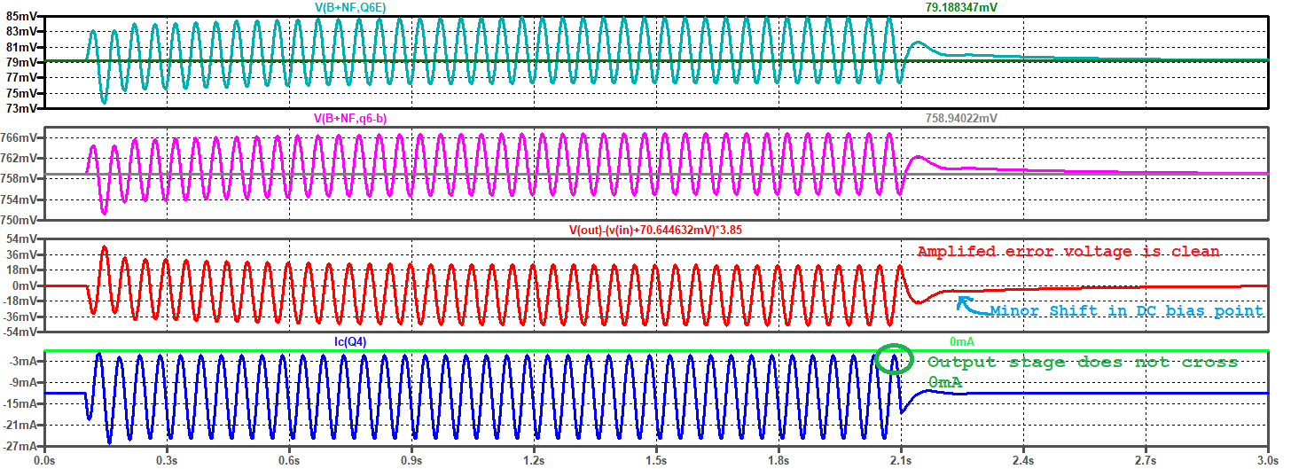 Lets go to 200% of the Class A point. We see some ugliness in the error voltage, but the bias points are still behaving.