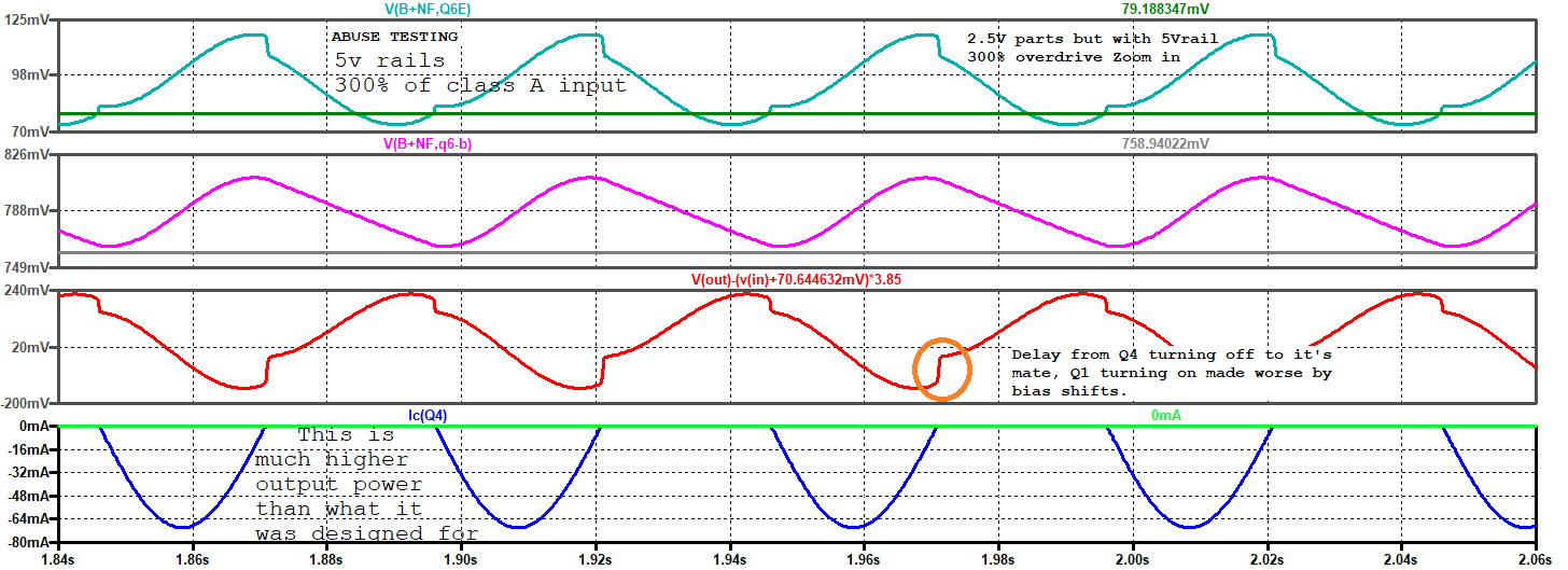 It's fun to beat up and abuse the circuit in SPICE. You don't get to smell the smoke (sigh . . .), but you don't have to buy and solder in replacement parts ( :-) ). Zooming in on the 300% overdrive we see it is Ugly! This is abuse testing. A couple of the unbuilt versions of this amp didn't recover gracefully when abused them like this in SPICE. The version 1.0 and 1.2 presented here do recover gracefully.