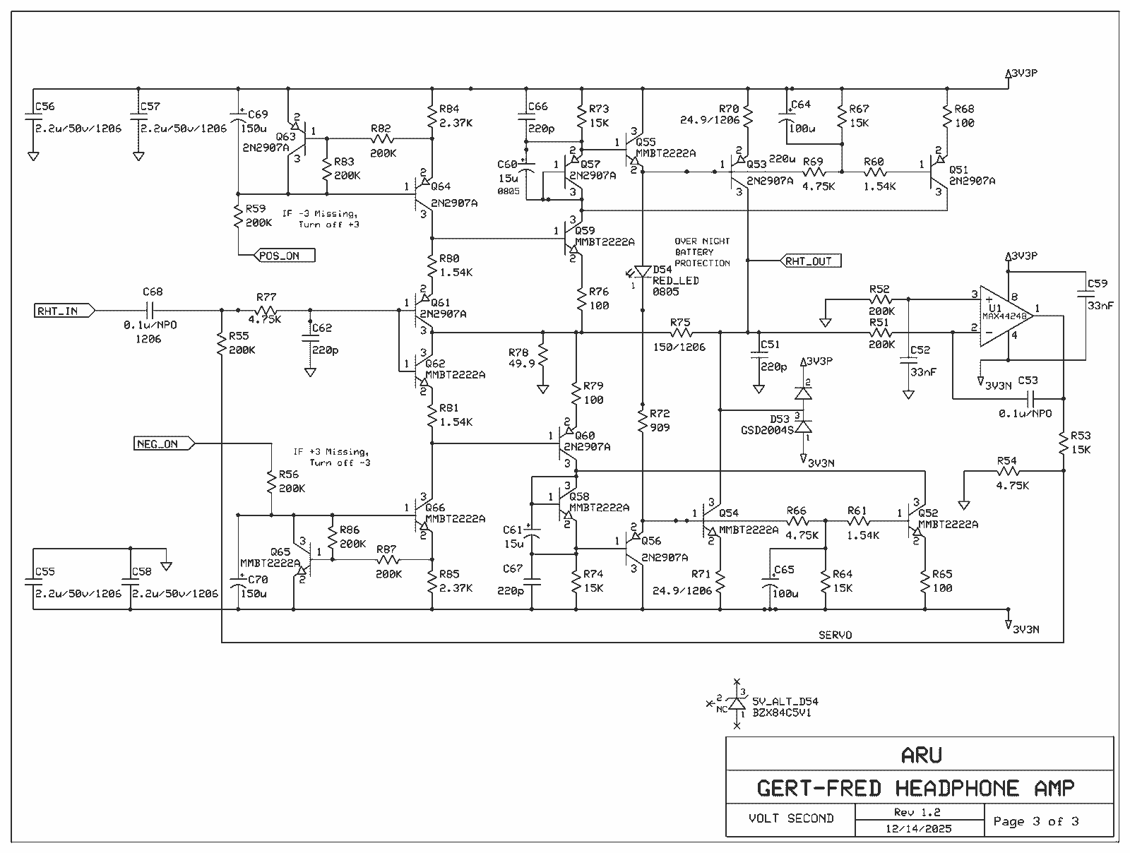 Static pick up (ESD) from the headphones isn't too likely to get past the ground connection at the output connector. On Version 0 and 1.0 I just put a spark gap on the output just because it was there. A spark gap won't protect the output stage. For 15kV 100pF 1500 ohm ESD protection, a diode with an internal resistance less than about 0.4 ohm clamping to the supply rails is needed to protect the output. In version 1.1, I added a BAV299 (D3, D53) for added ESD protection. A MMBD7000L doesn't protect because the internal resistance is too high. Since the modeling says the BAV will protect, I also changed the MMBD7000L in the on/off network 2 to a BAV299 to keep from adding a line item to the Bill of Material (BOM). That was until I found that a RED LED worked even better.