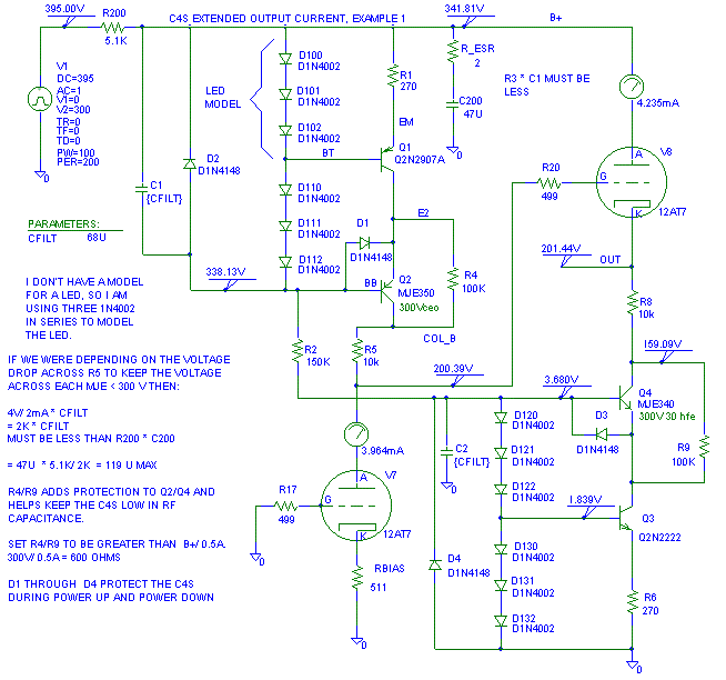 2 mA + 45 mA/30 + 45 mA/60 = 4.25 mAThese three resistors can be used as a balancing network to stack three > 200V capacitors to make a 600V B+ filter capacitor that the C4S runs from. I drew this using three capacitors to illustrate how to stack multiple capacitors and provide bias for the C4S at the same time. C201 to C203 are just values pulled out of a hat. If you use just one cap on B+, R5, R6 and R7 are still needed to bias the C4S.