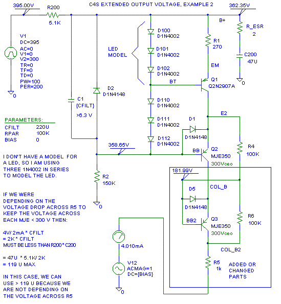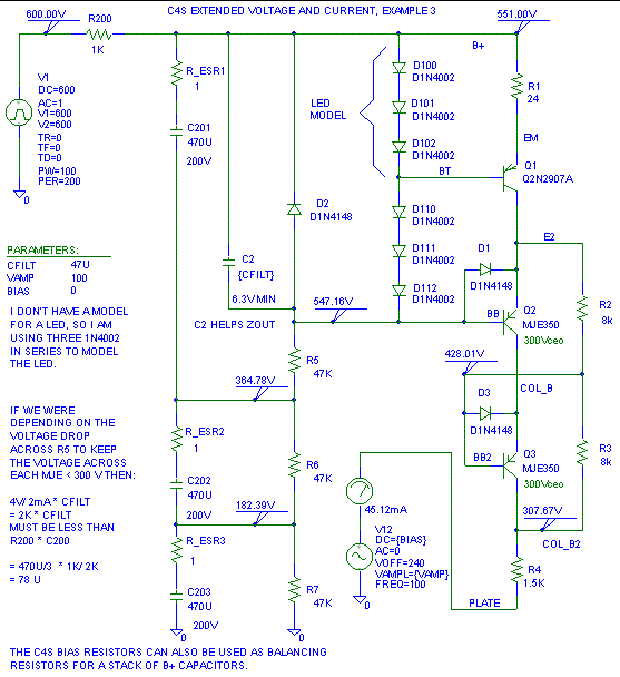 If we want to use this circuit at 600V, R2 becomes 270K >2 W (I'd use three 91 K 1 W in series for the 270 K) and R4 and R6 become 2 W each. With these changes the modified C4S will almost work to 600V peak B+. The "almost" is because Q2 and Q3 won't share voltage perfectly.