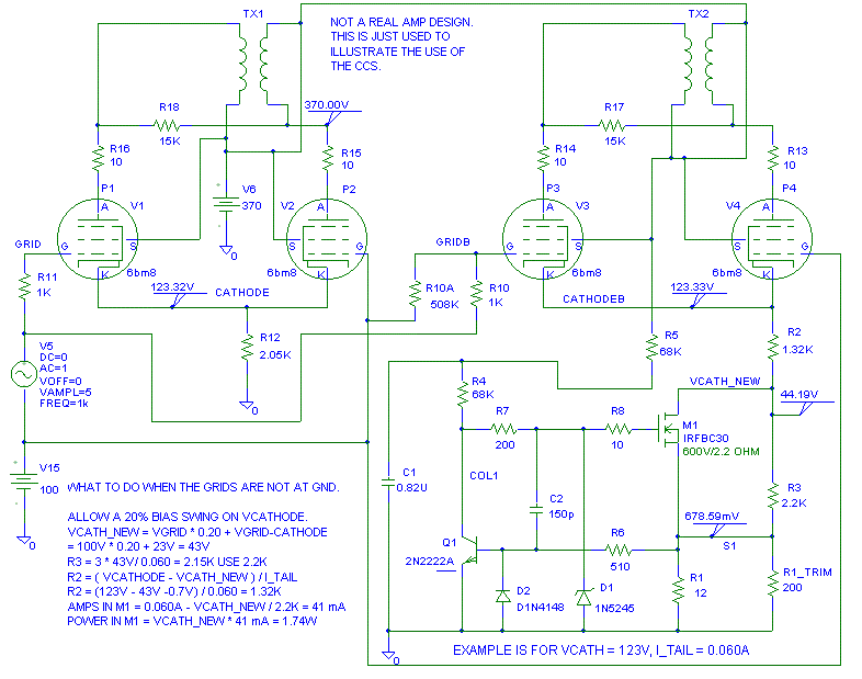 OK, how do we bias up the CCS if the driver is DC coupled to the output tube? If the driver is DC coupled to the output tube, the power loss in the CCS goes through the roof. The following is an example of how handle this.