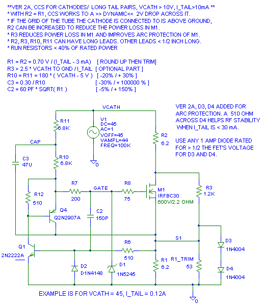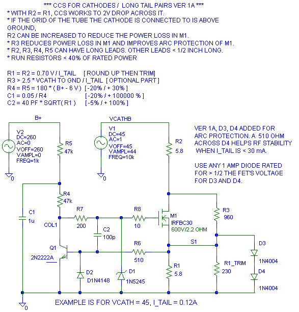 In ver 1A and ver 2A I added D3 and D4 for better arc protection. There is enough drain to source capacitance in M1 to damage the gate when there is an arc. D1, D3 and D4 work in concert to protect M1 and Q1. At light load currents the capacitance of these diodes makes a theoretical dip in the output impedance at 10 MHz. A 510 ohm resistor across D4 eliminates this dip. I don't know if it is a problem, but I'm telling what the fix is before you look. A fast diode for D3, D4 will recover from the arc faster than a 1N400x diode.