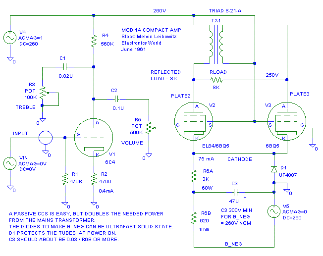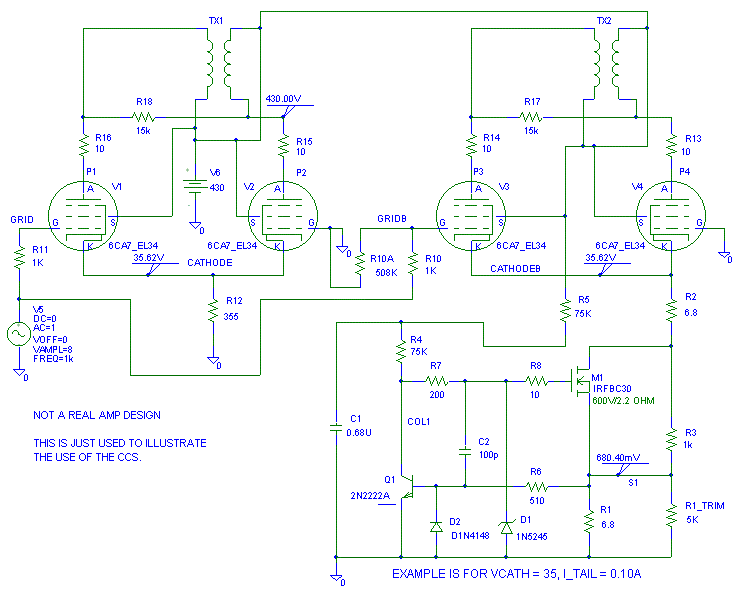 This technically isn't a true CCS, but it can work about as good as a solid state CCS on a long tail pair. Instead of running R6 to ground to bias the tubes, we run it to a voltage equal to the negative of B+. This "Passive CCS" means the HV winding of the mains transformer has to put out twice the current and you'll need a duplicate of the positive B+ capacitor bank to generate B_NEG. C3 and R6B provide the extra filtering we'll need to make the passive CCS quiet.