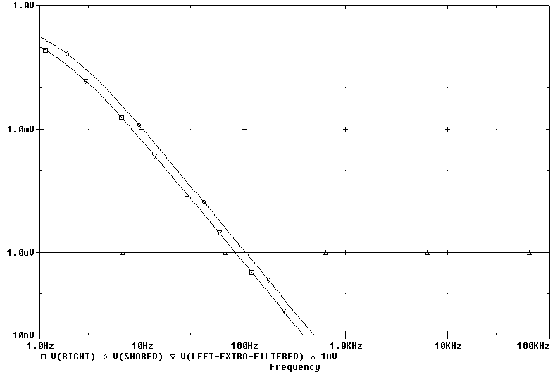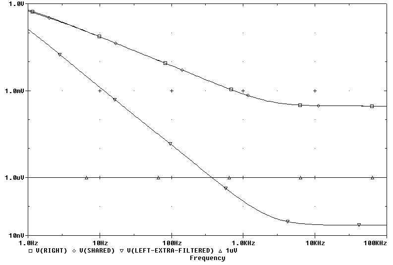 First let's check the "ideal" power supply output ripple with 1V applied at V1 and V2. I stopped the plot at 10 nV because voltages even in the uV range are too layout dependent to believe a Pspice analysis. The Pseudo Dual Mono PS change improves the output ripple only a little bit, but the stock circuit didn't need much improvement. (Doc Bottlehead and company's designs are well thought out!)