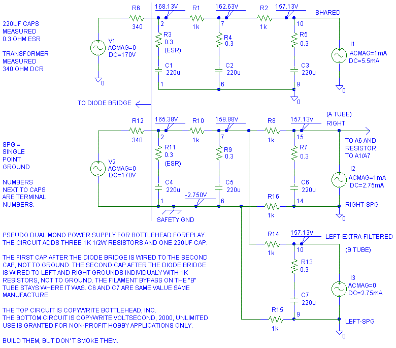For the cost of three 1K 1/2W resistors and one more 220 uF cap you can have a Pseudo Dual Mono power supply (PDMPS) for the Bottlehead Foreplay Preamp.
