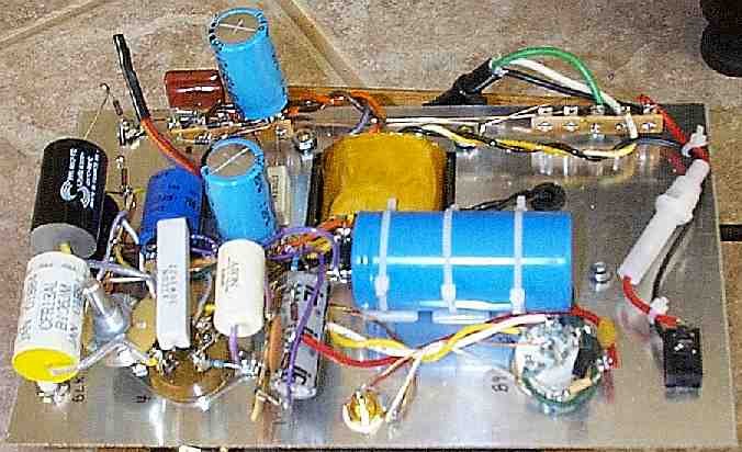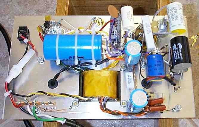 Below is a different view of the bottom (12/30/00). I'll shorten and tidy up the leads once I'm done playing around with parts as much as I current am doing. The top SCR (lossy Parafeed) capacitor will soon be RTV'd the SCR capacitor below it.