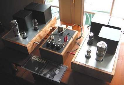 I brought a selection of CDs including Dead can Dance, Mark Isham, Oystein Sevag and others. Rich built a pair of beautiful looking "Billie" 300B MonoBlock amps sold by diyhifisupply.com and a Bottlehead Foreplay pre-amplifier. My first impression of the 4Pi's reminded me of a large pair of Klipsch Heresy. The speakers are much larger than I'd expected. At the time, they were still unfinished MDF. They've since been veneered and look super clean as seen below. We played some Rammstein and they get LOUD with excellent high and low frequency output. They may be the ultimate speakers for rock music. Rich also built a set of speakers with Radio Shack 40-1197 drivers mounted in PVC pipe, a pair with Jordan JX92s drivers and what I called the "shipping crates" with Fostex FE103 drivers mounted in 8 foot tall cabinets. The Billies sound Very nice with all the speakers.
