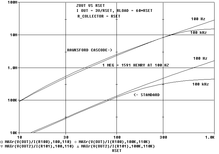 With RSET = about 50 ohms for 3V drop at 60 mA throughput and using the Hawksford Cascode mod, the graph above says we should see about 1 megohm at 100 Hz. To get 1 megohm at 100 Hz, we would need 1561 henries of inductance. That's a big choke. This big choke will probably have more capacitance at high frequencies than the C4S.