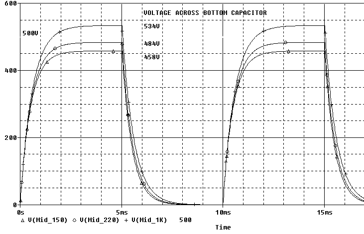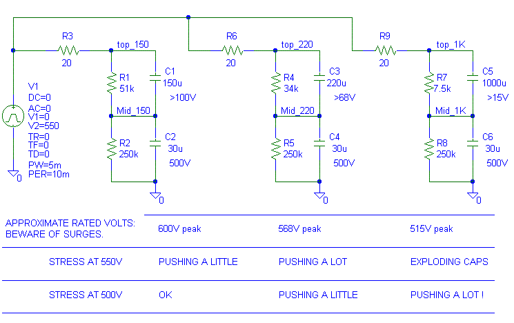 Notice that the third setup with the 1000 uF sees 534/500V = 107% of rated