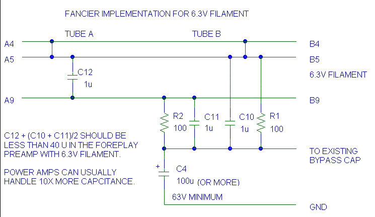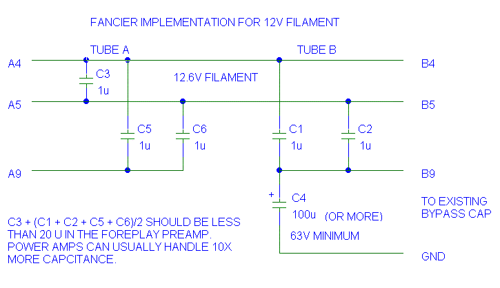 I'd probably use a 100 uF Mylar (TM) film bypassed with a 1 uF ceramic for cost and size reasons. Keep in mind that the C12 capacitor will be radiating filament noise so again: There ain't no such thing as a free lunch! (TANSTAAFL) I'll let every one know this works once my Paramour is done and the mods begin.