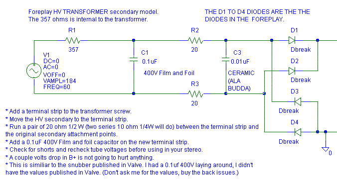 It recently rained for the first time in months at my house (I live in the Arizona desert and it doesn't rain too often) and while I had the scope on the Foreplay, the "A tube" had that darn radio station back on it with much more amplitude than the "B tube" did. I had a couple 1 uFs left, so I did the Fancy Implementation of the Foreplay filament snubber. The radio station pick up was reduced. I thought I heard an reduction in the system's background noise too. (It could also be that awful proud poppa syndrome acting up again too.)