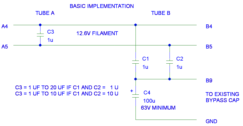 First I placed a 1 uF 50V X7R ceramic capacitor from each end of the filament to the existing 0.1 uF bypass cap on the tube's filament center tap. This was one cap pin B4 to pin B9 and one cap pin B5 to pin B9.Second, on the other tube socket, I place a 1 uF 50V X7R ceramic across the filament (pin A4 to pin A5).