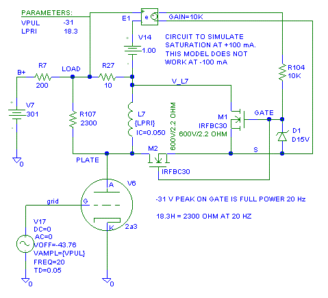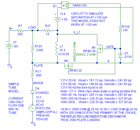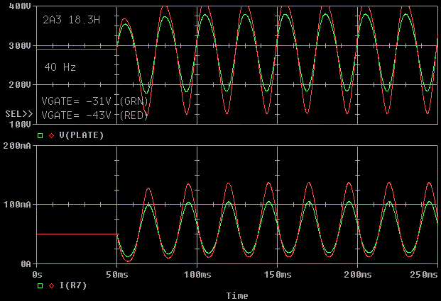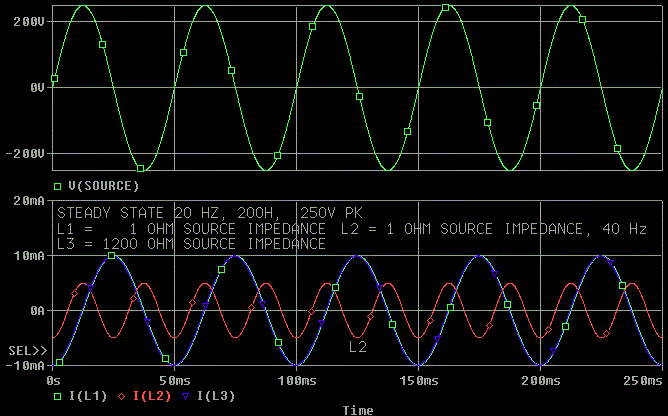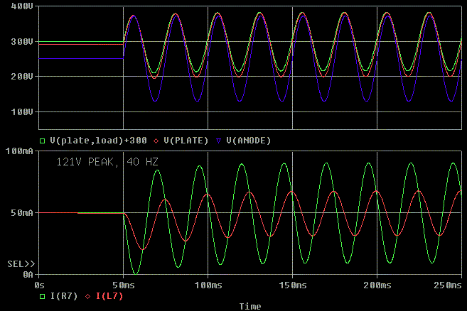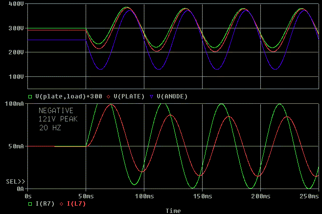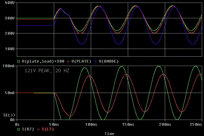 What happens if the voltage is the opposite polarity at 20 Hz? If you look below, we actually can theoretically make the 20 Hz tone burst in the opposite polarity if the tube can sink extra current. This means the tube could (if biased right) sink the extra current needed (112 mA peak) to generate the 20 Hz tone burst. There is only a little compression on the first half cycle as the inductor gets charged up. However, this successful tone burst really doesn't matter. We never really know which polarity the music will take so we can't guarantee the tone burst operation 20 Hz 121V, but we can guarantee it at 40 Hz 121V.