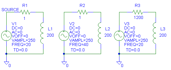L2 [red], which is running at 40 Hz, is running 1/2 at the saturation point. The 1200 ohms in L3's source isn't making much of a difference between L1's and L3's current flow because 200H at 20 Hz, ( 2 * pi * 200H = j25,132 ohms) is still much larger than 1200 ohms.