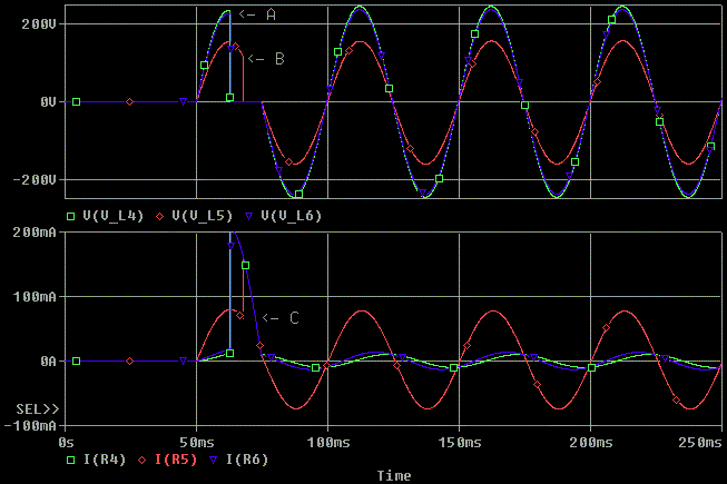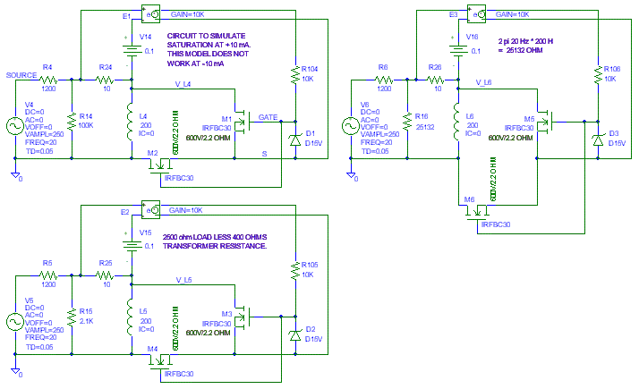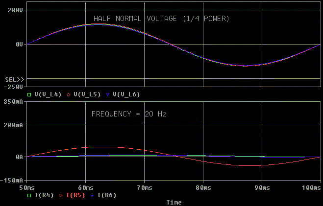 How much do we have to turn the power down to support a tone burst at 20 Hz?6 dB is enough to capture my attention. Here is a 20 Hz tone burst at 1/2 voltage (V5 = 196V and V4, V6 = 125V).The answer is 5.2 dB or about (1.8:1 in voltage) with the set up we have above.With a zero ohm voltage source, it would be 6.0 dB (2:1 in voltage).