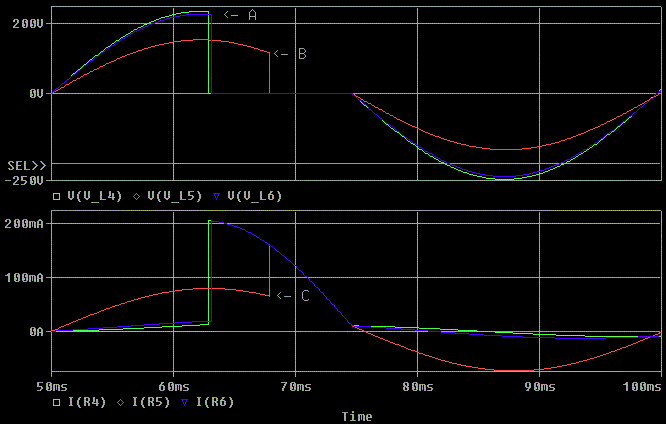 Notice that at point "A" the output voltage is a little lower than normal because of the saturation of the transformer. The plots for the 100K and 25K loads are almost on top of each other. Also notice that matching the load impedance to X_L of the transformer did not cause much of a change in the saturation point of the output signal because X_L is large (has lots of ohms) in this example. With a transformer that has a softer saturation, this drop won't be as abrupt.