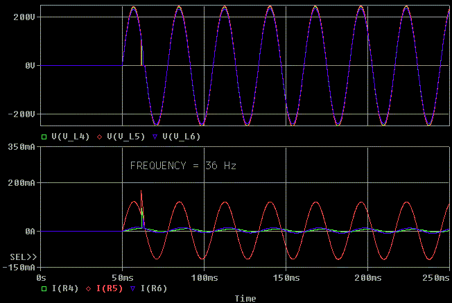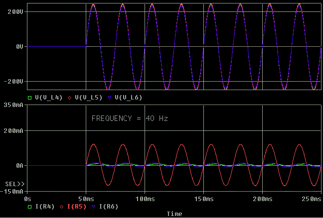 First notice that the voltage leads (occurs before) the current. Next notice 20 Hz inductor currents (L1 and L3) both saturate and the 40 Hz current almost saturates!