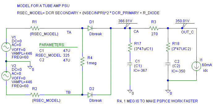 = ( 1/T * integral of (V(t) * I(t)) dt for t = 0 to T where T is the time for one cycle)/ (True RMS Volts * True RMS Amps )We have (315 V RMS + 315 V RMS) * 77 mA RMS = 48.5 VA of power being transferred through the transformer to get 350V DC * 60 mA DC = 21 watts. This is a power factor of 21 watts/ 48.5 VA = 0.433 = 1/2.31. The transformer must be designed to transmit 2.31 times the actual heating power (watts) going through it. (Yes, I know I lumped R3's loss (60 mA^2 * 270 ohm = 0.97 W) in the transformer.)