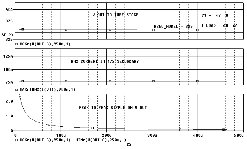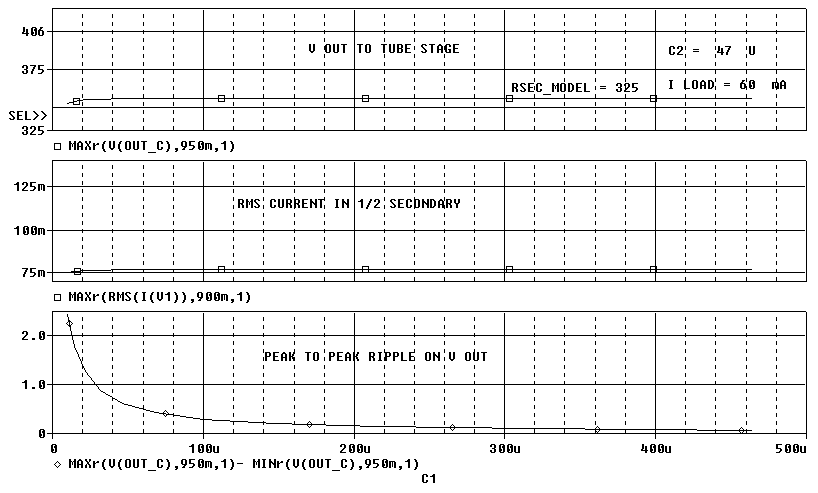 Note: I ran C1 up past 1000 uF because I knew someone a few years ago that put insanely dangerous amounts of capacitance in the B+ of his tube amp. I'll add a regulator before I add that much capacitance. With 1000s of uF at 500V, I'd be afraid that if a component failed it would explode with enough force to put a hole in the wall of the house and injure the neighbors. I'd want individual high voltage fuses in each of the capacitors in the bank he that set up.