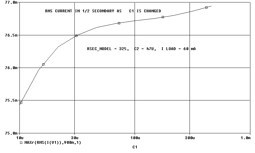 Let's take a closer look at the RMS current in the secondary. You can see that the RMS current in the secondary is getting slightly worse as C1 increases.