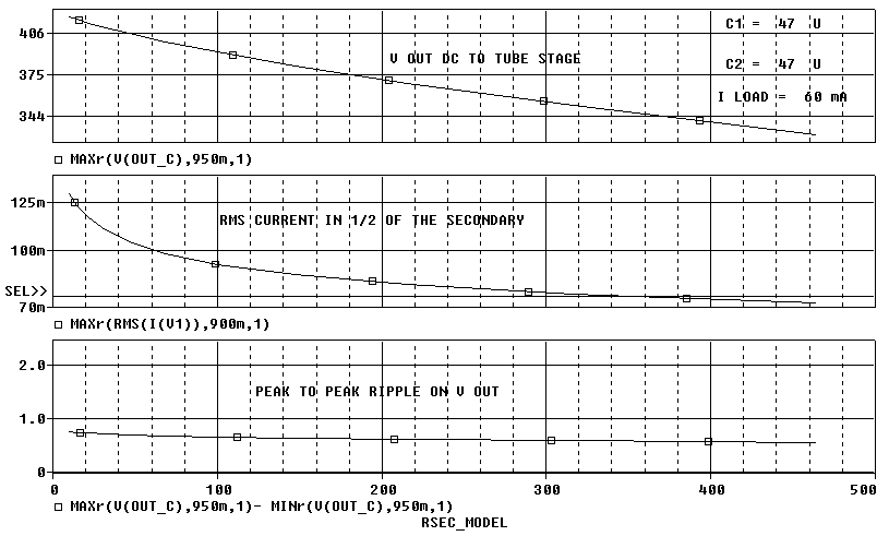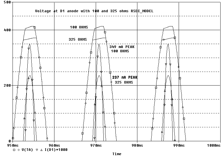 What happens if we change Rsec_model, which is the same as changing the regulation of the transformer?Regulation = ( 325 ohms * 77 mA RMS ) / 315 V RMS = 25V/ 315V RMS = 7.9 %.