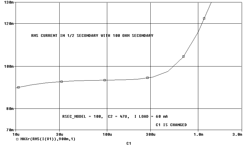 We can see as we vary C1 with RSEC_MODEL = 323 ohms, the output voltage, V( OUT_C), does not change that much nor does the RMS current in V1 (the transformer secondary). The peak to peak ripple on the output drops as we increase C1. WHERE is the doom and gloom I predicted about the RMS current rising as C1 is increased?