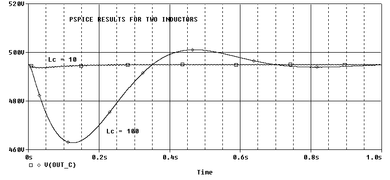 (495.2 V - 485.8 V)/ ( 0.068 A - 0.060 A) = 9.3825 V/ 0.008 A = 1178 ohms.What is this rise in output ripple at 100 H in the above graph? It is ringing of the LC filter tank as seen below for Lc = 10 and 100 henries: