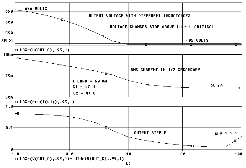R_load = DC V at first capacitor/ ( I load DC + I bleeder )Lets sweep the inductor value below and above L_critical and see that as Lc drops below L_critical, the output voltage starts to rise.