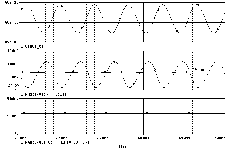 Notice that the RMS current in the secondary 1/2 winding has dropped to 69 mA RMS. The drop is because the current is being drawn all the time, not just at the crest of the sine wave.