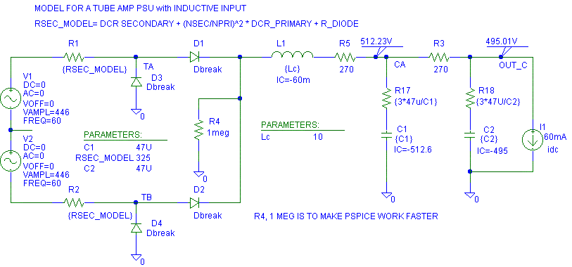 Lets first make a simple tube power supply schematic. The values for the transformer are similar, but not exactly the same, as a HV transformer I have.